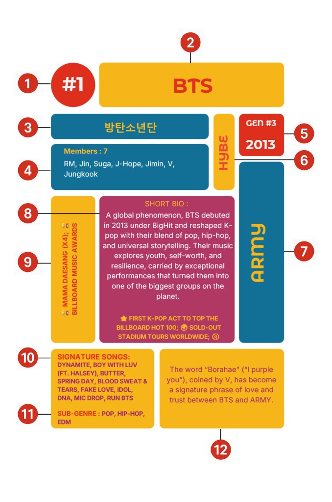 This beautifully crafted visual guide introduces 50 of the most influential groups and solo artists in the industry—BTS, BLACKPINK, NewJeans, Stray Kids, SEVENTEEN, aespa, LE SSERAFIM, and many more.